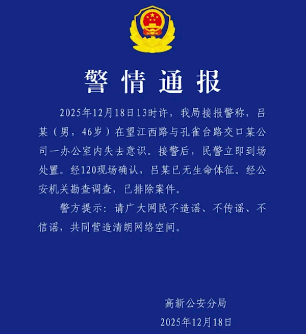根據(jù)安徽合肥高新公安分局同日(12月18日)通報(bào),2025年12月18日13時(shí)許,該局接報(bào)警稱,呂某(男,46歲)在望江西路與孔雀臺(tái)路交口某公司一辦公室內(nèi)失去意識(shí)。接警后,民警立即到場(chǎng)處置。經(jīng)120現(xiàn)場(chǎng)確認(rèn),呂某已無(wú)生命體征。經(jīng)公安機(jī)關(guān)勘查調(diào)查,已排除案件。