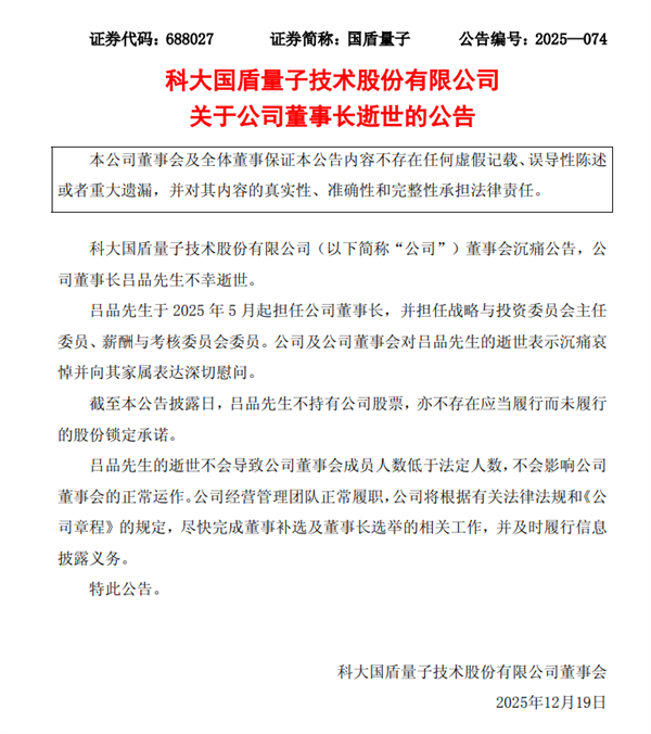 12月18日消息,國(guó)盾量子今晚發(fā)布通告稱,公司董事長(zhǎng)呂品不幸逝世。