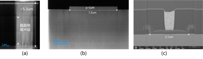 圖2.器件TEM與SEM截面圖:(a)高耐壓緩沖層外延;(b)p-GaN 柵;(c)低溫歐姆接觸