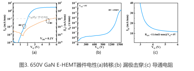 基于上述核心技術突破,團隊成功研制出高性能650V GaN E-HEMT器件。如圖3所示,該器件閾值電壓大于1.5V,漏極擊穿電壓超1500V,比導通電阻低于260mΩ·mm2,優(yōu)值 FOM(Ron × Qg)小于190mΩ·nC,關鍵參數(shù)達到國際先進水平,突破現(xiàn)有650V GaN器件的性能邊界。