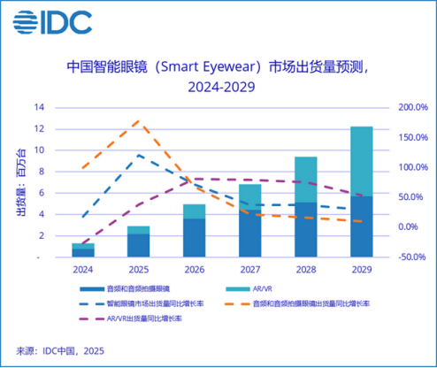 據(jù)IDC預(yù)測,中國智能眼鏡(含AR/VR眼鏡,及音頻和音頻拍攝眼鏡)2025年出貨量將突破290萬臺,同比增幅高達(dá)121%,2025年上半年,全球智能眼鏡市場出貨量達(dá)406.5萬臺,同比增長64.2%,到2029年,全球智能眼鏡市場出貨量將突破4000萬臺。IDC還預(yù)計,中國市場預(yù)計2024-2029年的復(fù)合增長率將達(dá)到55.6%,增速排名全球第一,到2030年,2030年中國智能眼鏡市場規(guī)?;蜻_(dá)5340億元,復(fù)合增長率超60%。