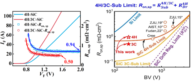 基于此團(tuán)隊(duì)創(chuàng)新性地提出“高質(zhì)量4H-SiC薄膜+低阻3C-SiC 襯底”的異質(zhì)集成方案,既保留 4H-SiC 的高結(jié)晶質(zhì)量與高擊穿場(chǎng)強(qiáng)優(yōu)勢(shì),又充分發(fā)揮 3C-SiC 的低電阻特性,成功打破了這一長(zhǎng)期制約器件發(fā)展的“兩難困境”,異質(zhì)集成材料襯底電阻率降至 0.39 mΩ•cm,較傳統(tǒng) 4H-SiC 襯底降低 45 倍,為低壓SiC 功率器件的性能躍升提供了新質(zhì)解決方案。