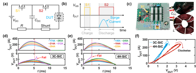 圖4 (a) 電路示意圖,(d)理想波形和(c)浪涌電流測(cè)試裝置的照片。不同浪涌電流水平下(d)4H/3C-SiC工程襯底和(e)4H-SiC襯底上SBD的電流和電壓波形,分別顯示在312 A和256 A峰值電流下發(fā)生故障。(f)使用最終安全耐受波形重建I-V特性。