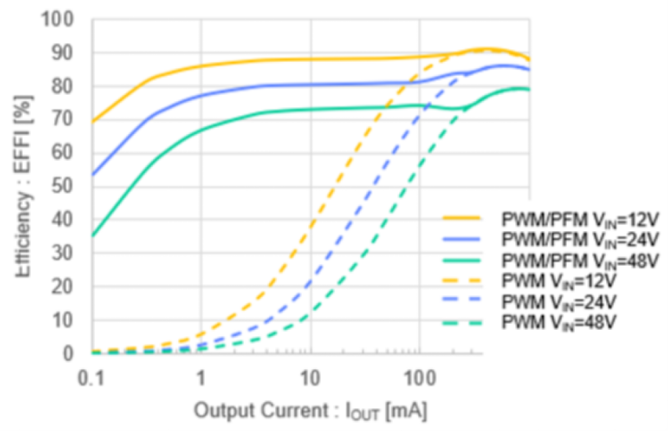 在PWM模式下,無論負(fù)載大小,開關(guān)頻率保持恒定,便于進(jìn)行噪聲對(duì)策;在PWM/PFM模式下,可從輕負(fù)載到重負(fù)載范圍實(shí)現(xiàn)高效率。該系列在60V輸入等級(jí)中實(shí)現(xiàn)了小型化解決方案尺寸(10.8 × 8.2 mm),兼顧小型化、低功耗以及輕負(fù)載高效率,可有效降低設(shè)備待機(jī)功耗。用本產(chǎn)品替代中高耐壓LDO,可解決發(fā)熱問題同時(shí)減少PCB面積。