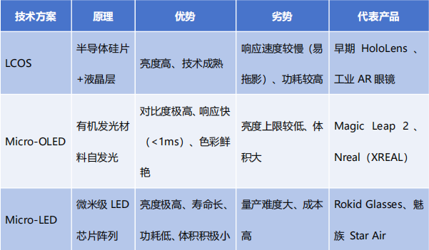 光源是AR顯示系統(tǒng)的核心,直接決定圖像亮度、色彩、功耗與體積。目前主流技術(shù)路線包括LCoS(硅基液晶)、Micro-OLED(硅基有機(jī)發(fā)光二極管)和Micro-LED(微米級發(fā)光二極管),三者并行發(fā)展,各具優(yōu)勢。