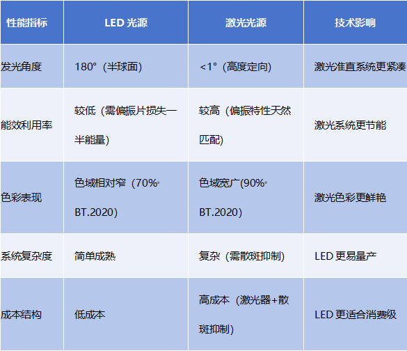 LED與激光在LCoS系統(tǒng)中的對比呈現(xiàn)出明顯的性能分化。LED光源具有成本低、功耗低和技術(shù)成熟的優(yōu)勢,但LED不適用于強(qiáng)光場景使用。激光光源則具有光束方向性強(qiáng)、單色性好和亮度高的特點(diǎn),但面臨成本較高、功耗高、散熱問題突出,并且激光的相干性易產(chǎn)生散斑、摩爾紋,需要外加光學(xué)件消除,進(jìn)一步增加成本。