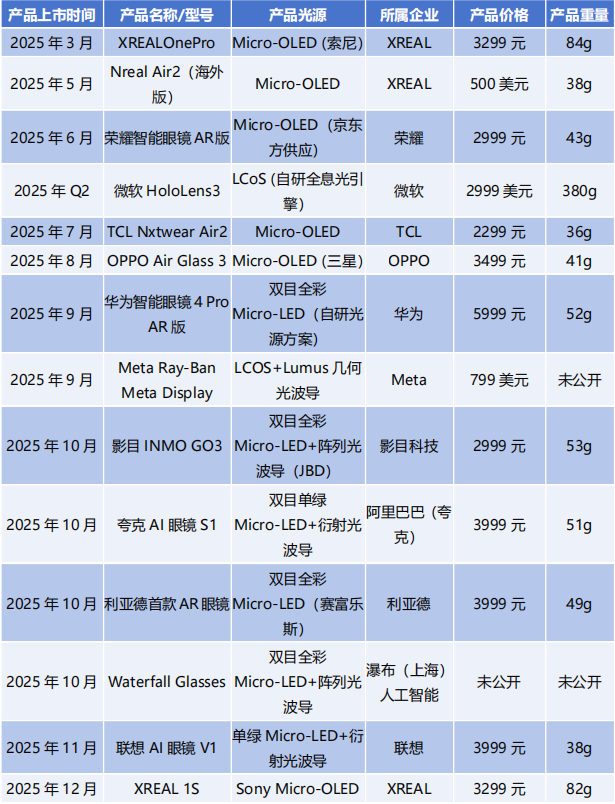 表3 2025年部分主要廠商推出的AR眼鏡產(chǎn)品信息