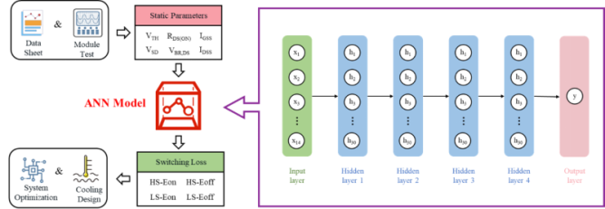 針對(duì)這一問(wèn)題,聯(lián)合研究團(tuán)隊(duì)提出了一種基于多層反向傳播人工神經(jīng)網(wǎng)絡(luò)(ANN)的開(kāi)關(guān)損耗預(yù)測(cè)新方法。該方法利用 SiC MOSFET 的靜態(tài)參數(shù)(如閾值電壓、漏電流、導(dǎo)通電阻等)與開(kāi)關(guān)損耗之間的回歸關(guān)系,無(wú)需復(fù)雜物理建?;騾?shù)提取,僅通過(guò)測(cè)試數(shù)據(jù)或數(shù)據(jù)手冊(cè)中的靜態(tài)參數(shù)即可直接實(shí)現(xiàn)開(kāi)關(guān)損耗的快速精準(zhǔn)預(yù)測(cè)。在1200V SiC MOSFET功率模塊數(shù)據(jù)集上的實(shí)驗(yàn)結(jié)果表明,該方法能夠取得最低1.13%的平均絕對(duì)百分比誤差(MAPE),最大誤差不超過(guò)7.43%,單模塊平均預(yù)測(cè)時(shí)間僅4.95毫秒,優(yōu)于其他對(duì)比方法。此外,該模型在NVIDIA Jetson系列嵌入式平臺(tái)上部署后性能無(wú)衰減,具備實(shí)際應(yīng)用價(jià)值,為功率模塊的熱設(shè)計(jì)優(yōu)化與批量質(zhì)量篩查提供了一種新的解決方案。