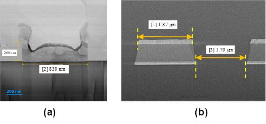 圖2.器件TEM與SEM截面圖:(a)高深寬比歐姆接觸形貌;(b)后端互聯(lián)