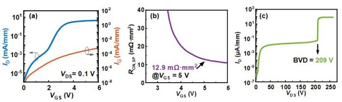 圖3. 100V GaN E-HEMT科研小器件電性(a)轉(zhuǎn)移;(b)導(dǎo)通電阻;(c)漏極擊穿