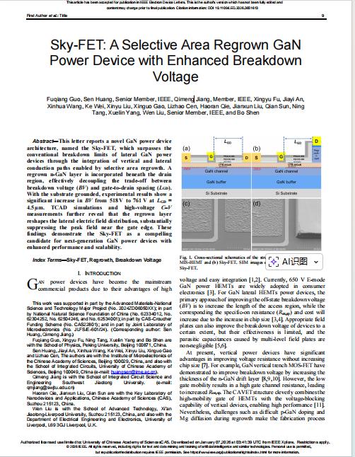 相關(guān)成果以《Sky-FET: A Selective Area Regrown GaN Power Device with Enhanced Breakdown Voltage》為題發(fā)表在《IEEE Electron Device Letters》上(DOI: 10.1109/LED.2026.3651613)。北京大學(xué)郭富強(qiáng)博士為論文第一作者,黃森研究員、蔣其夢教授為通訊作者。研究工作得到了國家自然科學(xué)基金重點(diǎn)項目、國家先進(jìn)材料重大科技專項、中國科學(xué)院-香港裘搓基金等項目支持。