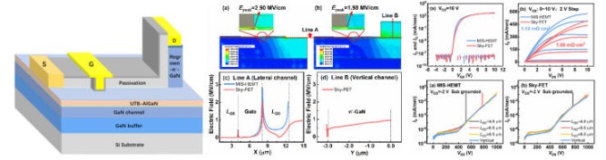 圖:基于Si襯底上超薄勢壘AlGaN(<6 nm)/GaN增強(qiáng)型技術(shù)平臺的Sky-FET器件結(jié)構(gòu),電場分布及直流擊穿特性,對比器件是超薄勢壘增強(qiáng)型MIS-HEMT器件。