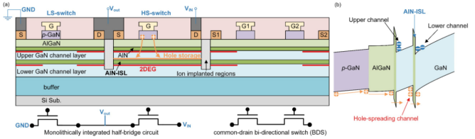 在本工作中,研究團(tuán)隊采用雙溝道設(shè)計,構(gòu)建了Si基p-GaN柵雙溝道氮化鎵功率集成平臺。通過溝道工程技術(shù),該平臺無需采用昂貴的工程化襯底、耗時的深槽隔離即屏蔽襯底引起的串?dāng)_的影響,實(shí)現(xiàn)高性能的半橋集成電路和單片集成雙向開關(guān)。