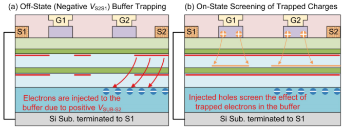 圖7. (a)負(fù)向耐壓時垂直電場引起緩沖層中陷阱捕獲電子,(b)DC-BDS中從柵極注入的空穴沿空穴輸運(yùn)層彌散,屏蔽掉俘獲的電子對器件導(dǎo)通電阻的影響。