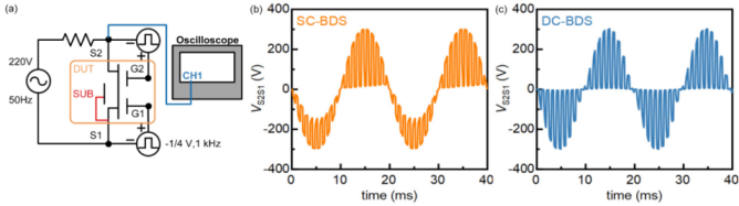 圖6. (a)AC斬波測試示意圖,(b)使用DC-BDS得到的AC斬波波形,(c)使用SC-BDS得到的AC斬波波形。在測試中,襯底固定與第一源極相連。