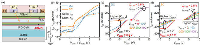 圖4. (a)測試結(jié)構(gòu)示意圖,(b)雙柵特性,其中第一柵極的空穴注入顯著強(qiáng)于第二柵極,(c)-(d)測試所得的電流-電壓特性。