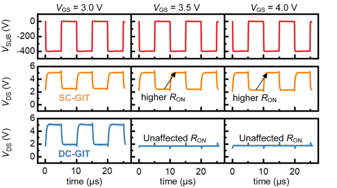 在Si基GaN功率集成平臺上,如果將硅襯底與地相連,那么上管的導(dǎo)通電阻會因負(fù)向背柵效應(yīng)顯著增大。研究團(tuán)隊分別將SC-GIT和DC-GIT通過2 kΩ的負(fù)載電阻與5 V的直流電源相連,并在襯底施加−400 V的100 kHz的脈沖偏壓以研究負(fù)向背柵效應(yīng)對器件導(dǎo)通電阻的影響。圖3比較了不同柵壓(VGS = 3.0/3.5/4.0 V)下的VDS測試波形。當(dāng)襯底施加−400 V的偏壓時,SC-GIT的導(dǎo)通電阻增加,從而使得VDS變高。然而,對于DC-GIT,當(dāng)VGS ≥3.5 V,即有大量的空穴從柵極注入時,積累在空穴輸運(yùn)層的空穴可以沿著該層擴(kuò)散至整個器件有源區(qū),從而屏蔽負(fù)向背柵效應(yīng)對器件導(dǎo)通電阻的負(fù)面影響,因而測試得到的VDS維持不變。