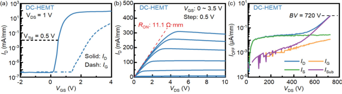 圖2. DC-GIT的靜態(tài)特性:(a)轉(zhuǎn)移特性,(b)輸出特性,(c)擊穿特性。