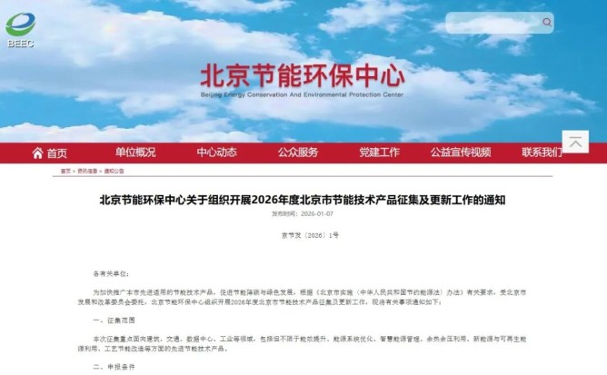 為充分發(fā)揮先進節(jié)能技術的支撐作用,助力北京綠色發(fā)展,根據(jù)《北京市實施〈中華人民共和國節(jié)約能源法〉辦法》有關要求,北京節(jié)能環(huán)保中心近日正式啟動2026年度節(jié)能技術產(chǎn)品征集及目錄更新工作,面向社會公開征集具有推廣價值的先進節(jié)能技術產(chǎn)品。
