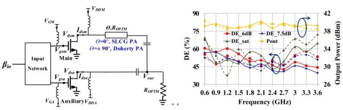 針對(duì)傳統(tǒng)負(fù)載調(diào)制功率放大器因匹配網(wǎng)絡(luò)相移引入的固有帶寬限制問(wèn)題,團(tuán)隊(duì)系統(tǒng)研究了網(wǎng)絡(luò)相移與調(diào)制象限之間的內(nèi)在聯(lián)系。通過(guò)嚴(yán)謹(jǐn)?shù)睦碚撏茖?dǎo),首次證明當(dāng)主放大路徑相移隨頻率變化時(shí),可在無(wú)開關(guān)式G 類模式與 Doherty 模式之間實(shí)現(xiàn)帶內(nèi)平滑過(guò)渡。
