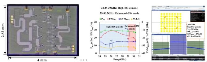在電路實(shí)現(xiàn)層面,基于0.15 μm GaN-on-SiC 工藝,本文實(shí)現(xiàn)了一款寬帶高線性DEPA。在 400 MHz 帶寬、峰均比 9.65 dB 的 5G NR 64QAM 信號(hào)激勵(lì)下,該放大器在 24.25–29 GHz 和 29–30.3 GHz 頻段內(nèi)分別實(shí)現(xiàn)了 超過(guò) 20% 和 16.9% 的平均功率附加效率,同時(shí)始終保持低于 –25 dB 的均方根誤差矢量幅度,展現(xiàn)出優(yōu)異的寬帶、高線性與高效率綜合性能。