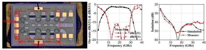 基于0.15 μm GaN-on-SiC 工藝實(shí)現(xiàn)的 SPDT 開關(guān)在 10–28 GHz 頻段內(nèi)插入損耗低于 2.1 dB,隔離度超過(guò) 42 dB,IIP3 高達(dá) 50 dBm,兼具寬帶、高隔離與高線性特性。進(jìn)一步地,團(tuán)隊(duì)將研究拓展至多通帶 SPST 開關(guān)設(shè)計(jì),通過(guò)引入帶通匹配網(wǎng)絡(luò),實(shí)現(xiàn)了 15–40 GHz 頻段內(nèi)低損耗與高隔離度的統(tǒng)一,為高功率毫米波射頻前端提供了可靠的工程解決方案。