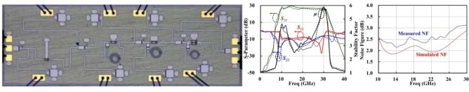 面向新一代寬帶接收系統(tǒng)的應(yīng)用需求,團(tuán)隊(duì)開展了高性能超寬帶低噪聲放大器設(shè)計(jì)技術(shù)研究。通過(guò)引入創(chuàng)新性的電感反饋網(wǎng)絡(luò),結(jié)合電容、電感與電阻構(gòu)成可調(diào)反饋回路,研究建立了基于晶體管小信號(hào)模型的數(shù)值優(yōu)化方法,在增益平坦度與噪聲性能之間實(shí)現(xiàn)有效平衡。