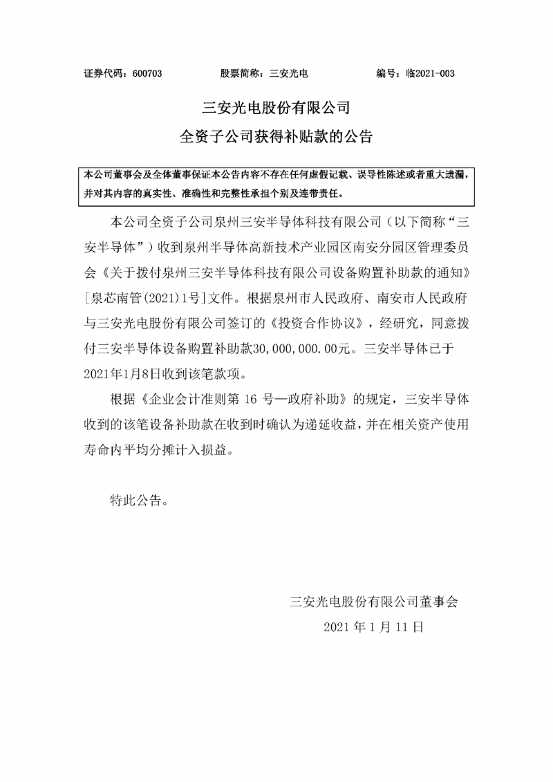 三安光電全資子公司泉州三安半導(dǎo)體收到設(shè)備購置補助款3000萬元