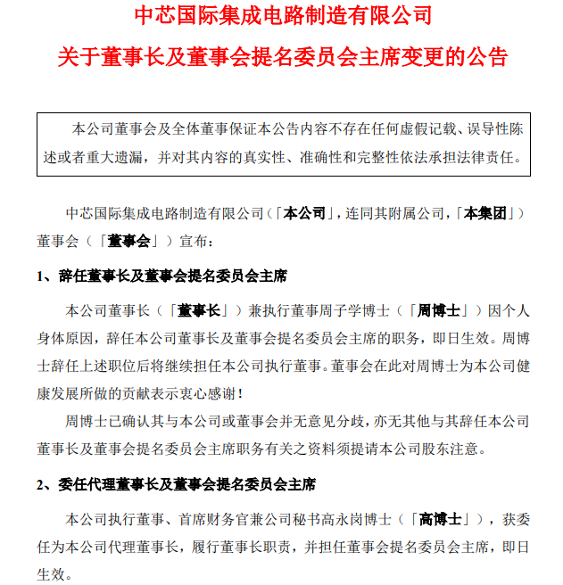 中芯國(guó)際換帥!周子學(xué)辭任董事長(zhǎng),高永崗擔(dān)任