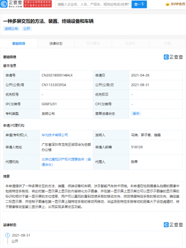 華為公開智能汽車技術領域新專利,可實現(xiàn)多屏交互