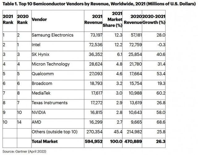 Gartner:2021年全球芯片銷售額增長26% 三星重返第一,
