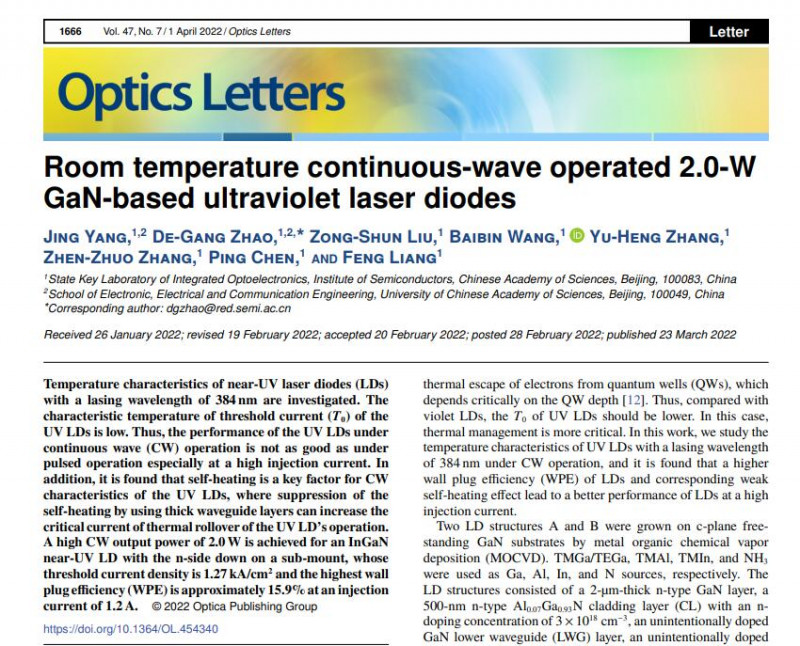 中科院半導體所趙德剛團隊研制出室溫連續(xù)功率2W的