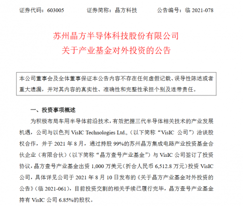 晶方科技:晶方產業(yè)基金擬出資1000萬美金投資Visic公司